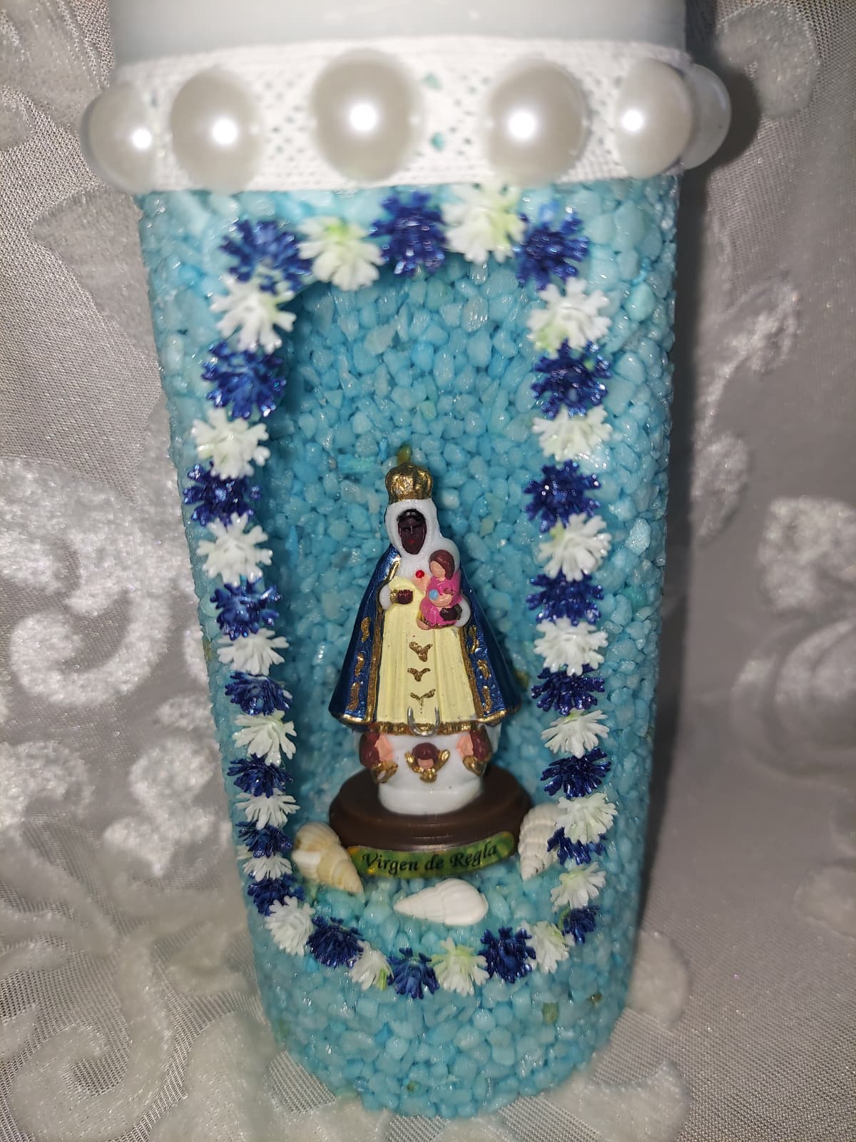 Piedras de Fe Yemaya (var. 2). Vela grande artesanal con acabado de piedras decorativas. Ideal para altares, devocion y obsequios especiales. Categoría: Velas Religiosas. Medidas: 7 cm de ancho x 21 cm de altura. Peso: 2 lb 10 oz (≈2.625 lb). Hecha a mano con materiales de calidad, pensada para transmitir luz, paz y energía positiva.