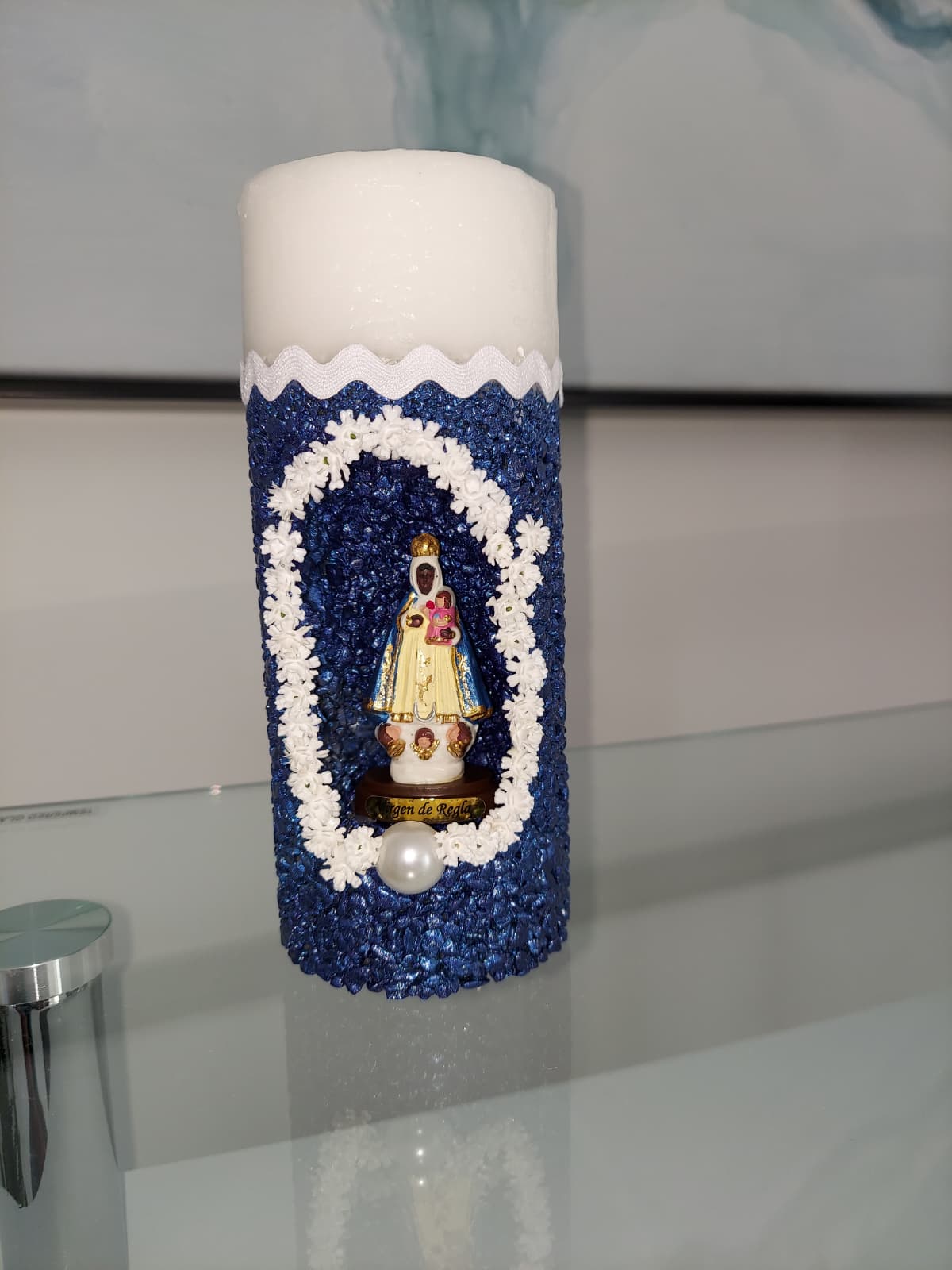 Piedras de Fe Yemaya. Vela grande artesanal con acabado de piedras decorativas. Ideal para altares, devocion y obsequios especiales. Categoría: Velas Religiosas. Medidas: 7 cm de ancho x 21 cm de altura. Peso: 2 lb 10 oz (≈2.625 lb). Hecha a mano con materiales de calidad, pensada para transmitir luz, paz y energía positiva.