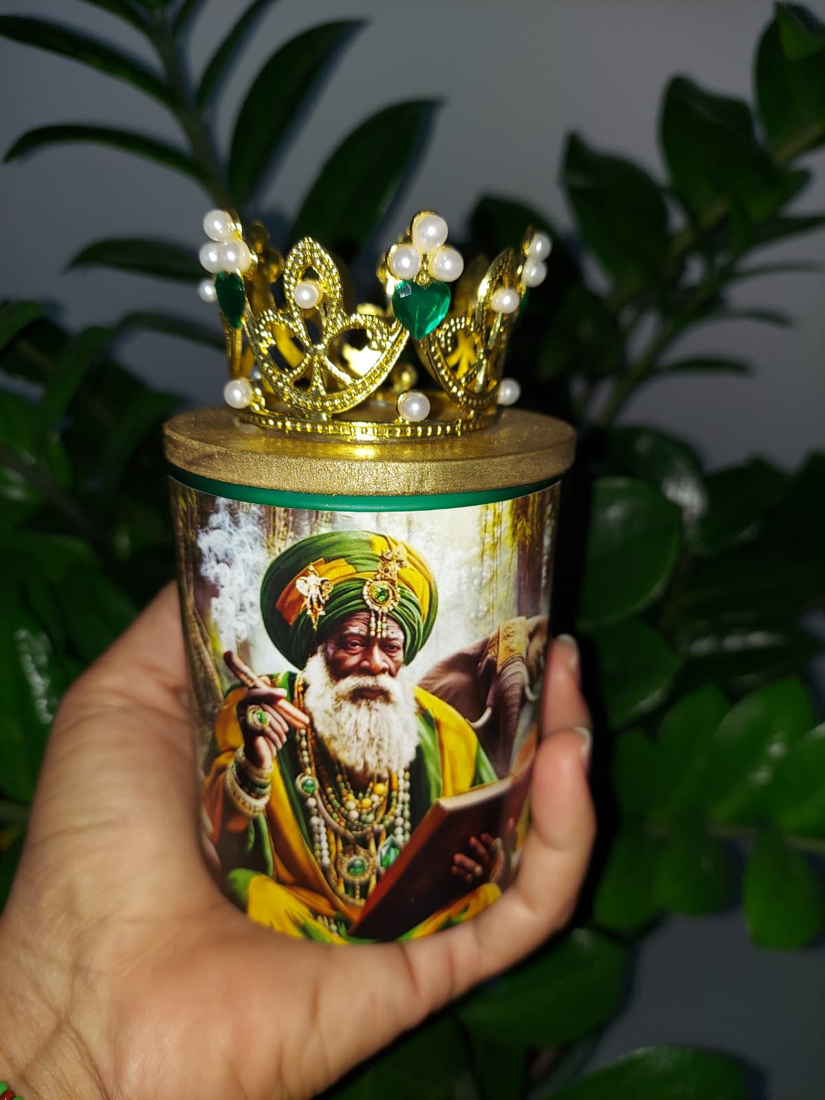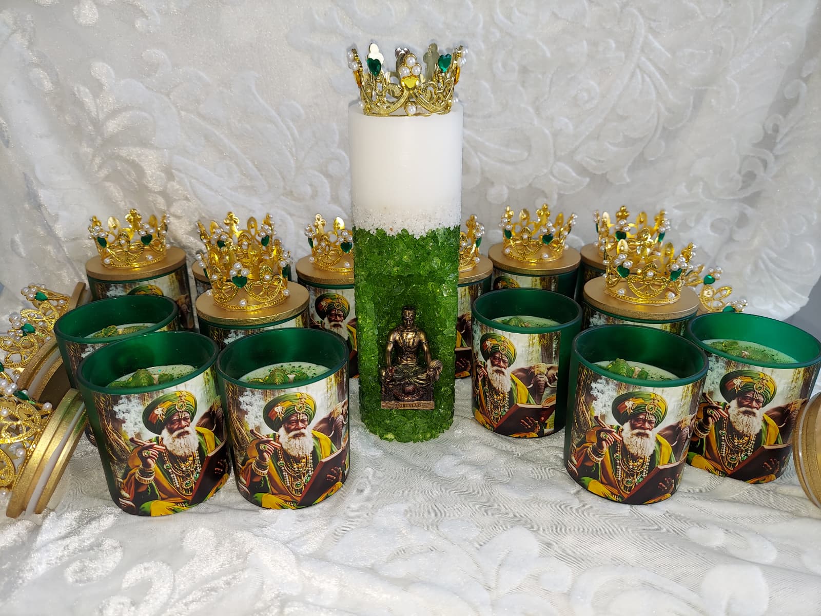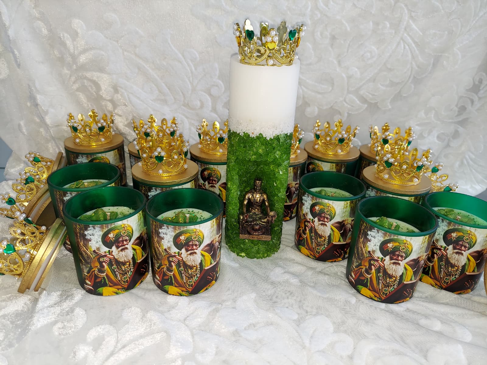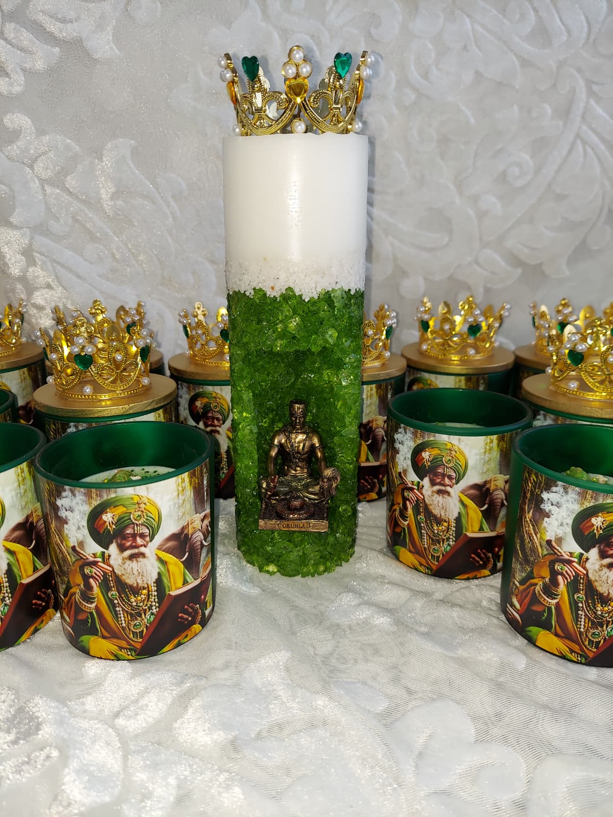 Vela de vaso en honor a Orula, orisha de la sabiduri?a y la adivinacion. Perfecta para consultas y trabajos espirituales. Peso: 10 oz.