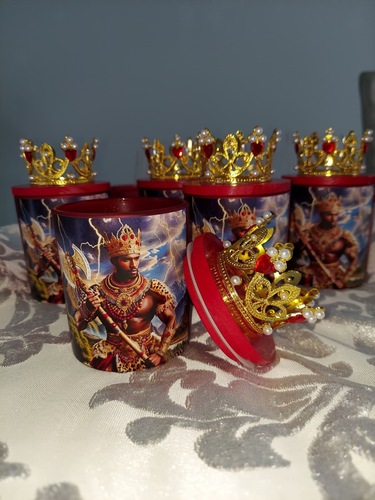 Vela de vaso con imagen de Shango, orisha del trueno y la justicia. Utilizada en rituales de poder y proteccion. Peso: 10 oz.